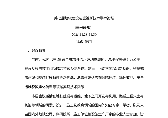 第七届地铁建设与运维新技术学术论坛于2025年11月28日-11月30日 在江苏徐州召开,欢迎全国从事地铁建设或相关工作的专家出席本届会议。